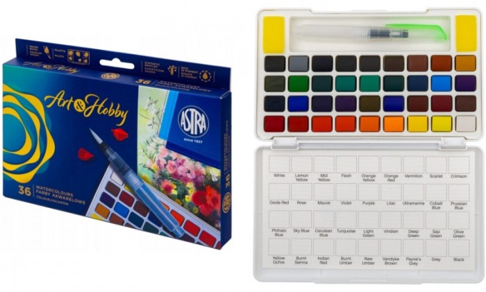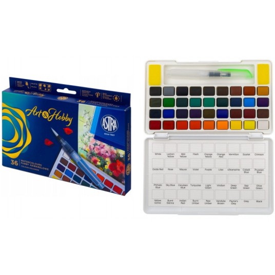 FARBY AKWARELOWE 36 KOL Z PĘDZLEM WODNYM ASTRA