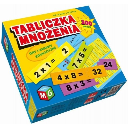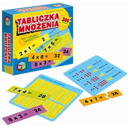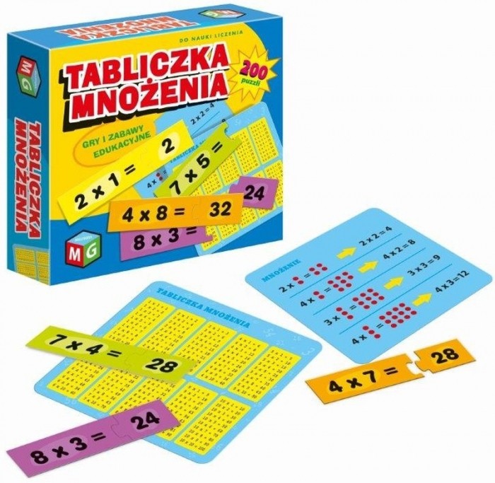 Zawartość pudeła: tabliczka mnożenia, 200 puzzli z mnożeniem, worek, instrukcja.