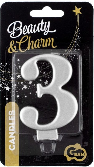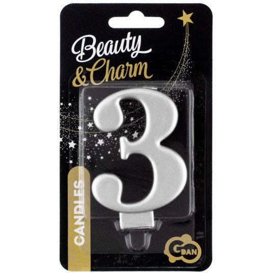 ŚWIECZKA CYFERKA SREBRNA "3" METALIK 8cm