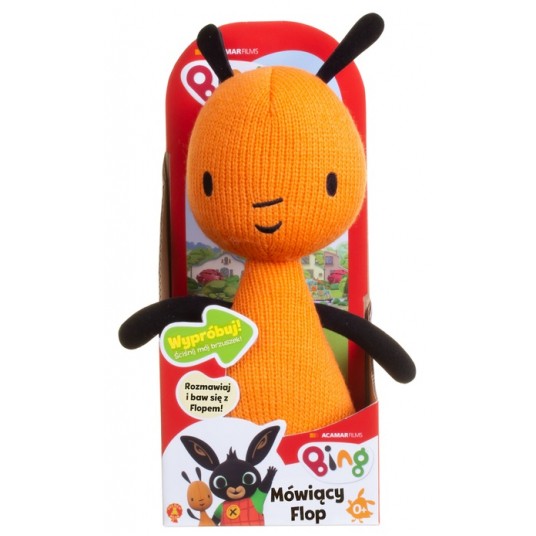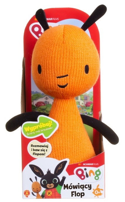 Twoje dziecko z niecierpliwością wyczekuje emisji kolejnego odcinka opowiadającego o przygodach Króliczka Binga i grupy jego wspaniałych przyjaciół? Podaruj mu fantastyczną maskotkę przedstawiającą najlepszego przyjaciela głównego bohatera bajki – Flopa, z którym nie tylko może się bawić, ale również rozmawiać! Flop każdego dnia towarzyszy młodemu króliczkowi w codziennych wyzwaniach. Opiekuje się nim jak prawdziwy rodzic, troszcząc się o jego dobro. Cechuje go cierpliwość i wyrozumiałość. Doskonale rozumie Binga i zawsze służy dobrą radą zachęcając malucha do działania. Maskotka przedstawiająca Flopa została wykonana z przyjemnego w dotyku materiału. Posiada 27 centymetrów wysokości. Charakterystyczny splot tkaniny sprawia, że najlepszy przyjaciel Binga prezentuje się tak samo jak w bajce. Wystarczy delikatnie nacisnąć na jego brzuszek, aby zachwycił najmłodszych zabawnymi interakcjami.