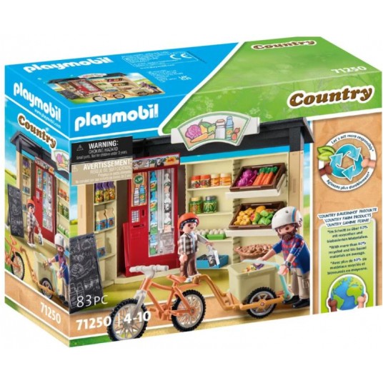 Wewnątrz opakowania znajdziecie dwie figurki Playmobil oraz wiejski sklepik z automatem do sprzedaży mleka i półkami uginającymi się od ekologicznych produktów spożywczych.